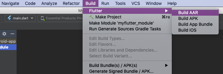 To build your app, the Android Studio plugin configures your Android project to add your Flutter module as a dependency.