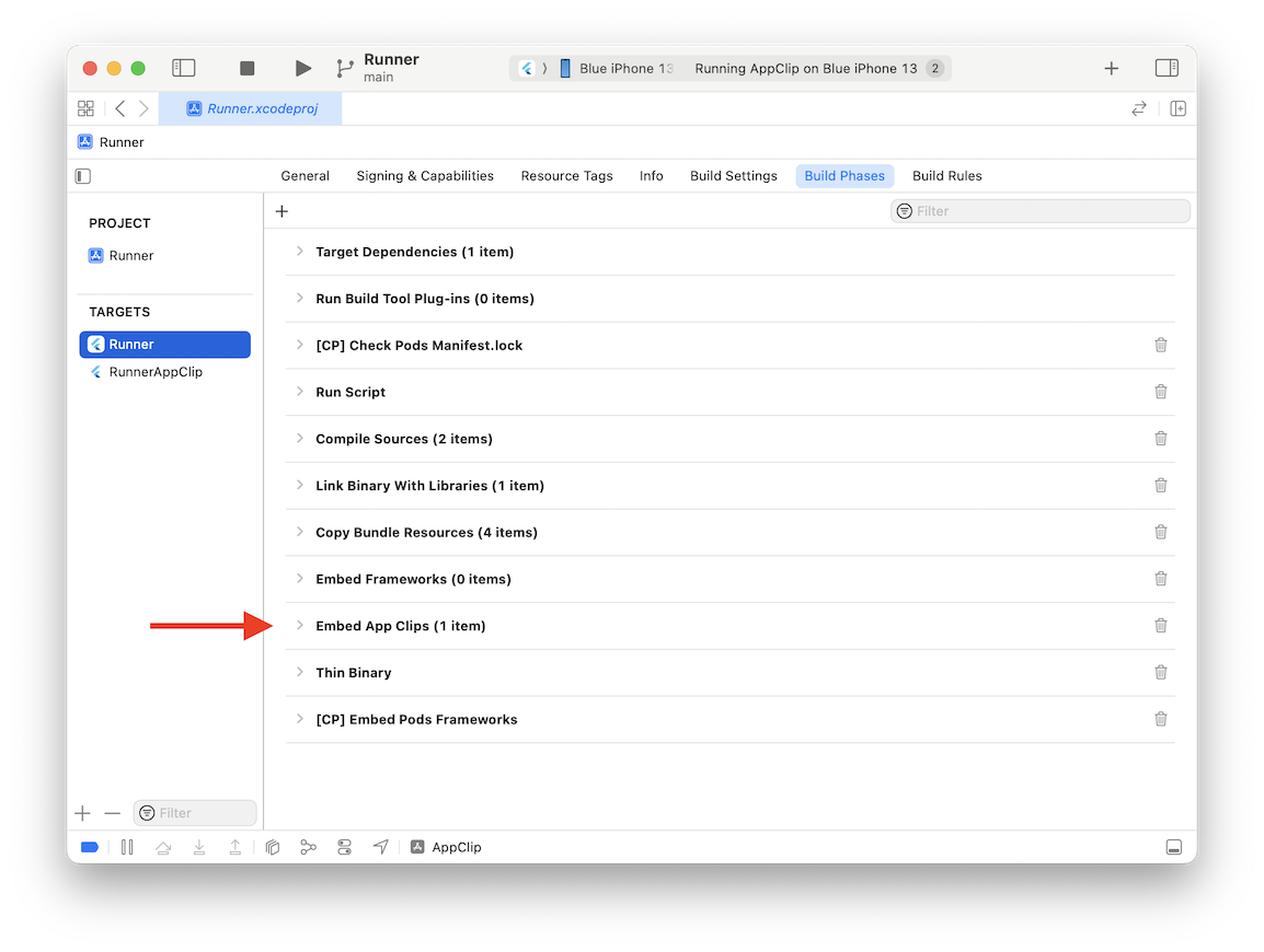 Back in the project settings, open the Build Phases tab. Drag Embedded App Clips to above Thin Binary.