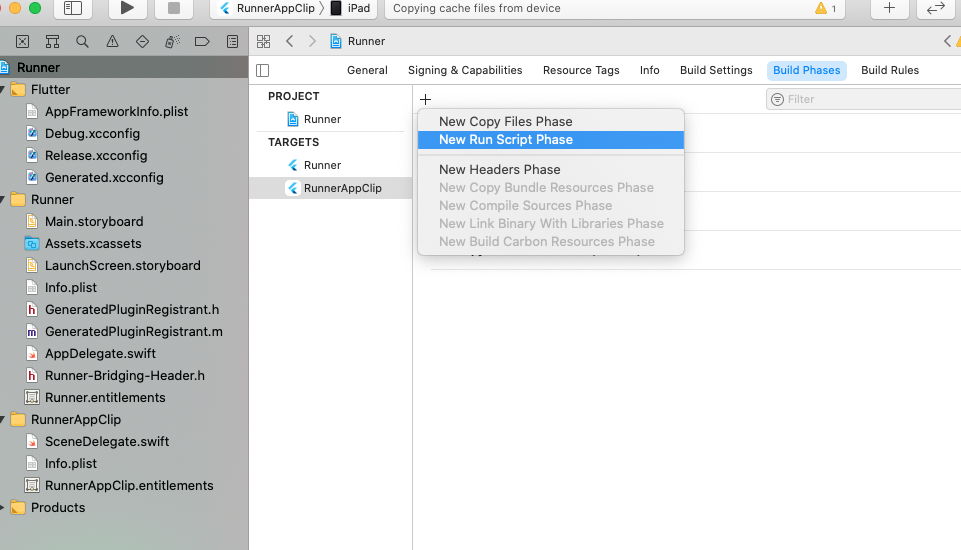 Now open the Build Phases tab. Press the + sign and select New Run Script Phase.